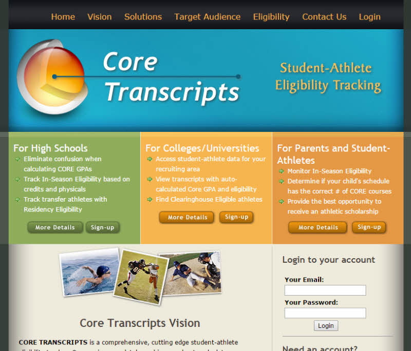 Web application that allows high school athletes, their parents, coaches and guidance counselors to track their academic progress toward becoming an NCAA level athlete. Detailed tracking of academic performance for all NCAA Core Transcript requirements, school attendance, injuries, etc.